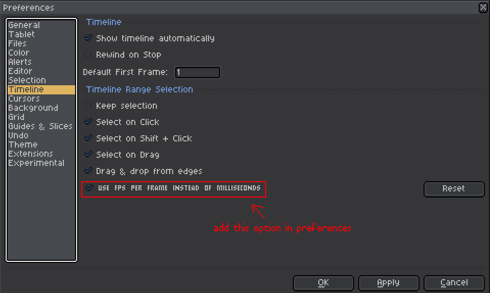 As someone who regularly animates in Aseprite, I’m frequently frustrated by having to do the manual math of a per-frame setting. The math is simple! I’m not asking anyone to fundamentally change how the timeline works, just an option to switch to a UI where that math happens. IE, functionally the same, but instead of specifying milliseconds, specify the FPS for that specific frame.