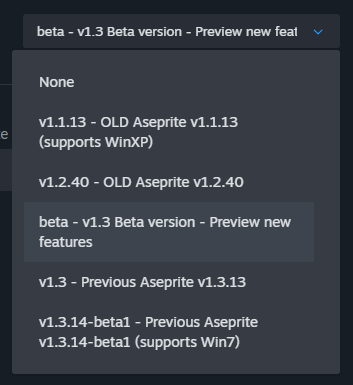 I would love to try out these cool new beta features, but through the Steam beta settings for Aseprite the latest version I’m able to opt into is 1.3.14-beta1. I’m on Linux, can that explain something maybe?