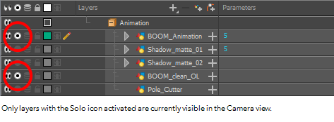 Yes, actually only the eye icons are switched (just as it happens when we Alt+click an eye to soloing a layer from the timeline). But it’s a nice idea to have some extra clue (not sure about adding a new column, but probably an alternative eye icon).