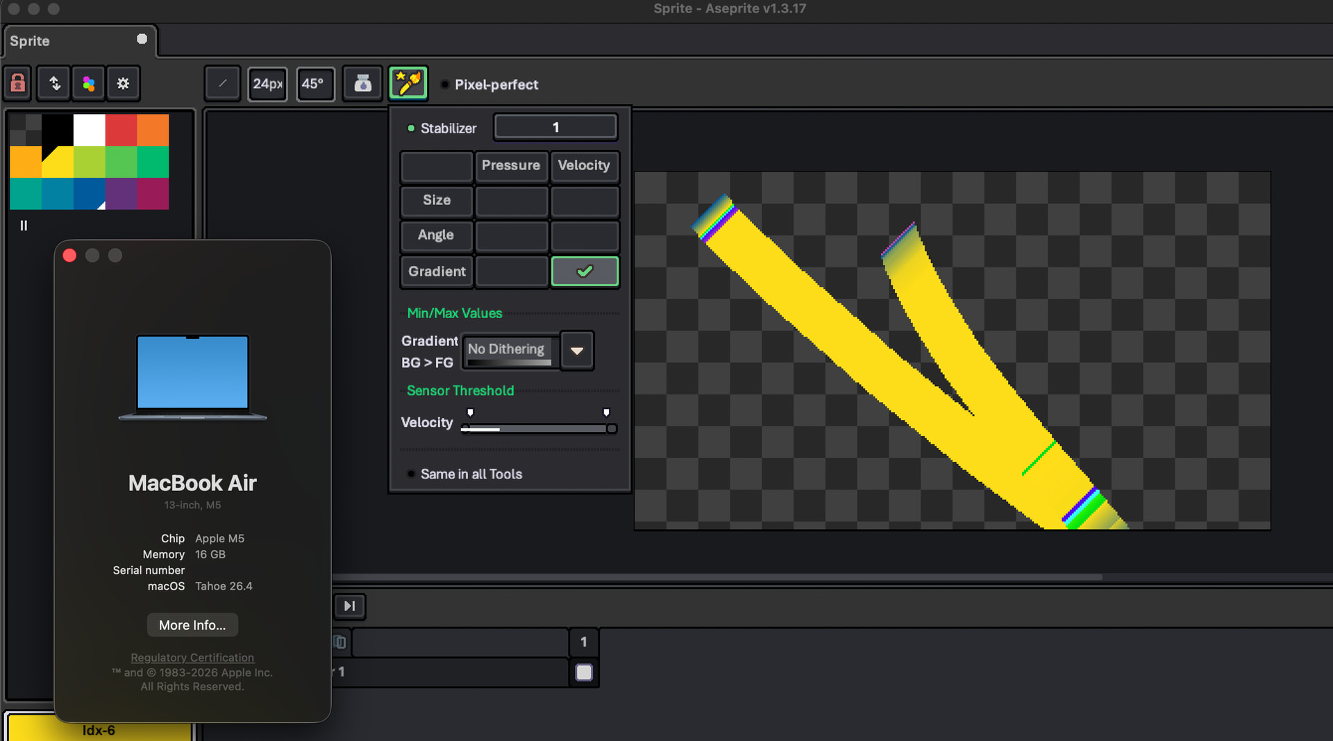 Aseprite version 1.3.17 on macOS Tahoe 26.4, opened from Steam. The cursor input device is a laptop track pad.