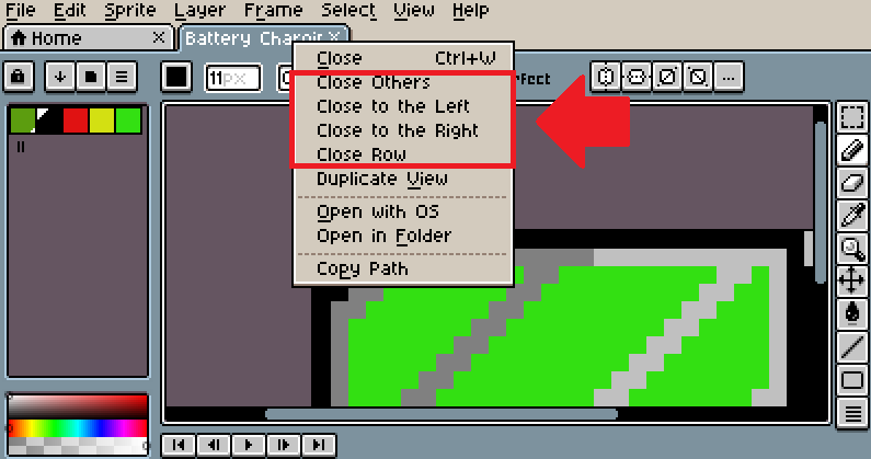 I like how other apps like Visual Studio Code have several ways to close multiple tabs at once so I made a plugin that does that for Aseprite too.