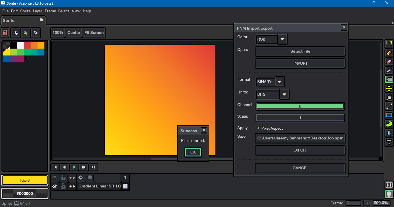 I’ve been working on a Lua script to import and export files in the PNM family. The script is aimed at Aseprite version 1.2.40 or later. The code can be downloaded at the following Github repo: