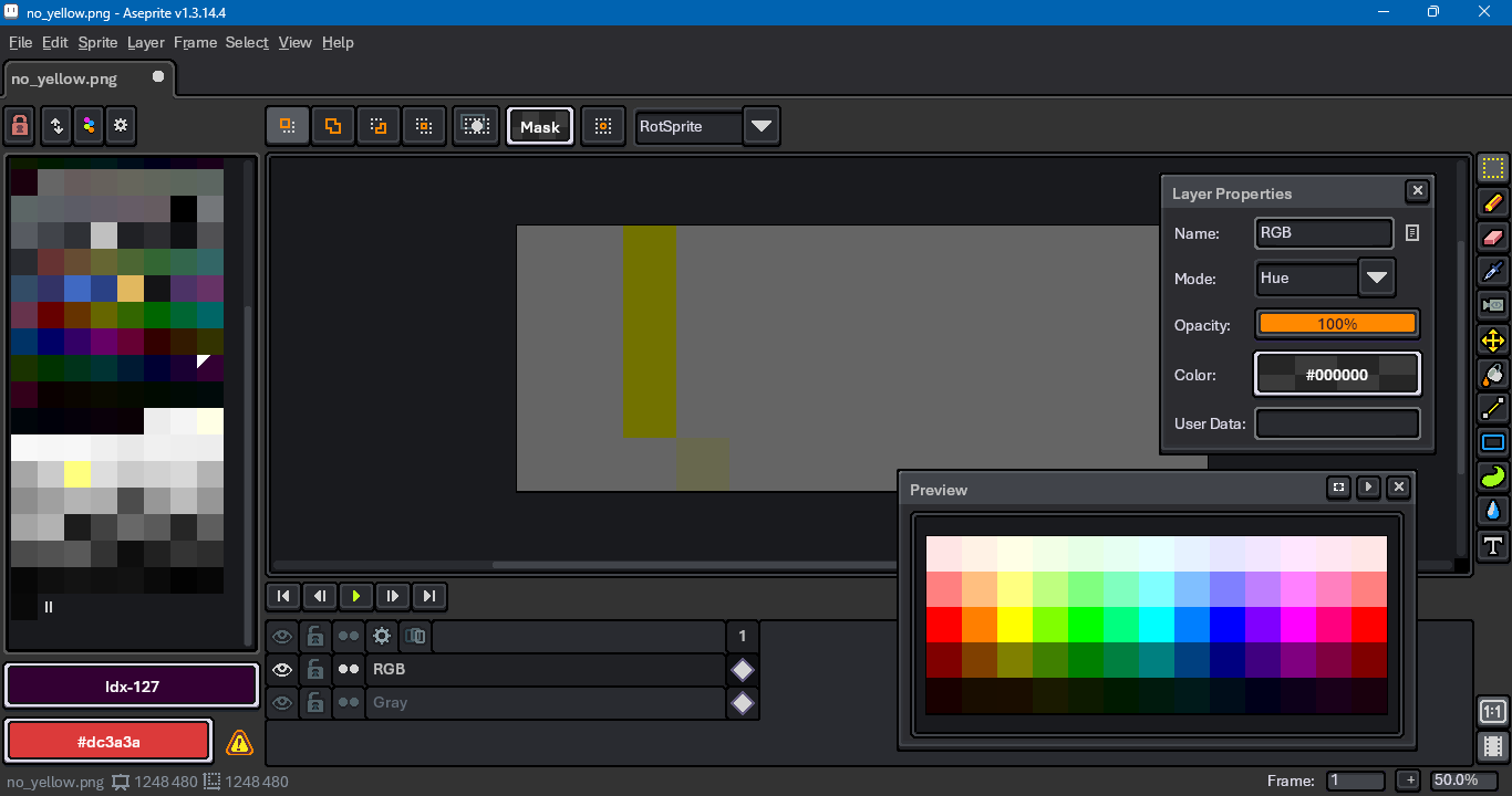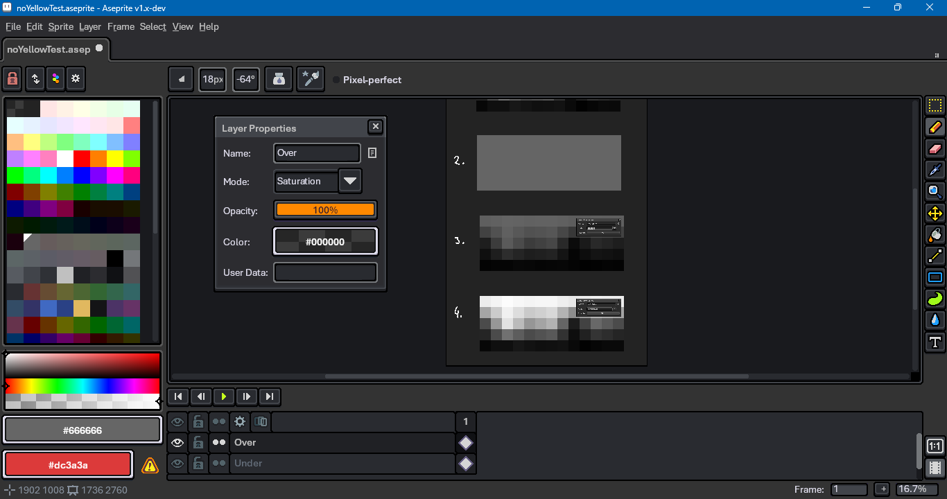 I am messing around with color swatches, and trying to desaturate my colors using a new layer in the blend mode “saturation”. And it does not work if the hue is a perfect yellow. The value does not matter, and if the hue shifts only one to the left or right, it also works, but perfect yellow specifically is unaffected by the blend mode.