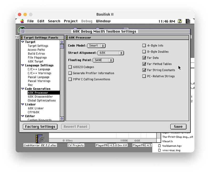 options in the CodeWarrior 68K Processor settings (see image below).