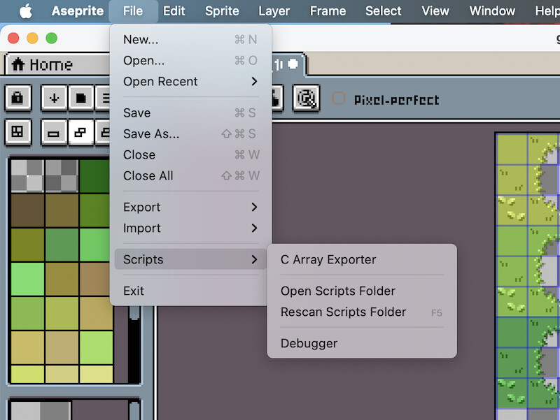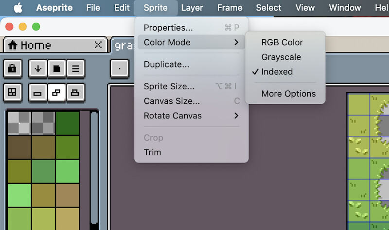- Your tileset MUST be indexed (8bit) in Aseprite (SPRITE → Colour Mode -. INDEXED)