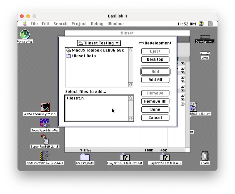 -That’s it, we’re done with Aseprite. - Get your fancy new tileset.h file onto your System 7 machine (or emulated environment).
